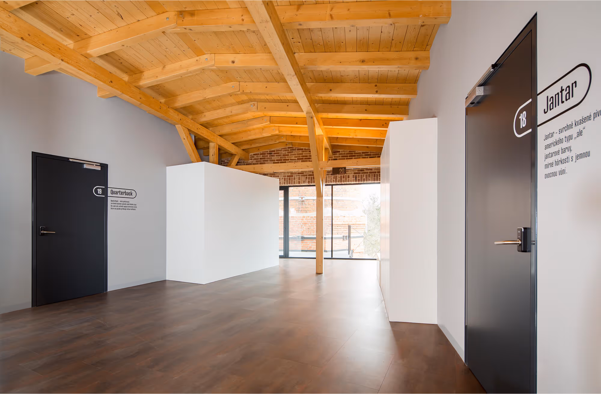 Každý pokoj má své jméno a číslo, odkazující na piva, která se vaří o patro níže. Hosté tak mohou nocovat v „jedenáctce“ nebo usnout pod cedulkou nesoucí název speciální várky – je to hra, orientační systém i připomínka, že tady všechno souvisí s pivem, s řemeslem a s místem.