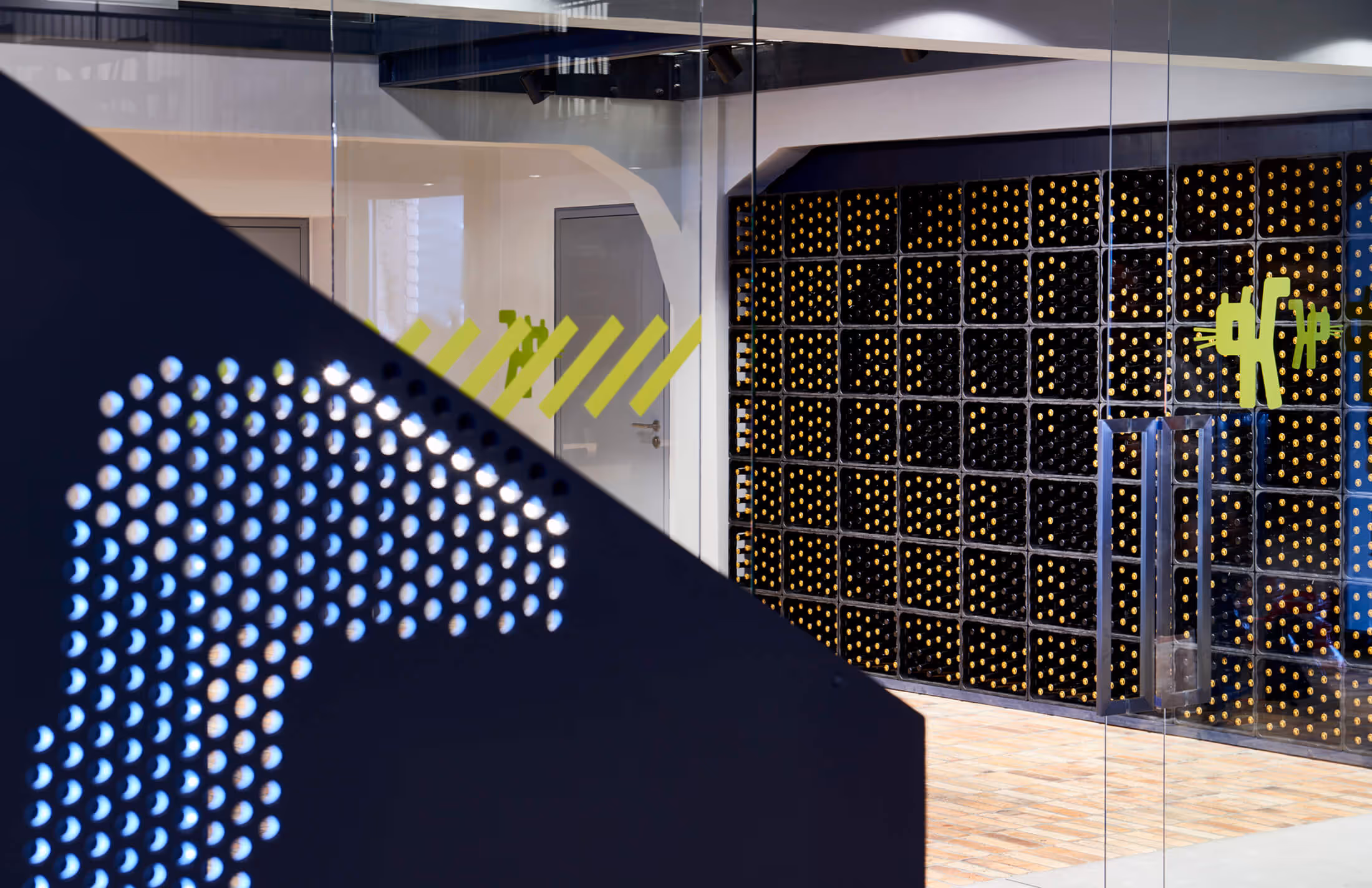 Výrazným akcentem jsou bary. Jeden se odráží od motivu nekonečného pole ječmene, druhý září digitálním displejem z pivních lahví s výhledem do spilky. Podhledy zdobí zavěšené pivní tácky – drobný, ale osobitý detail.