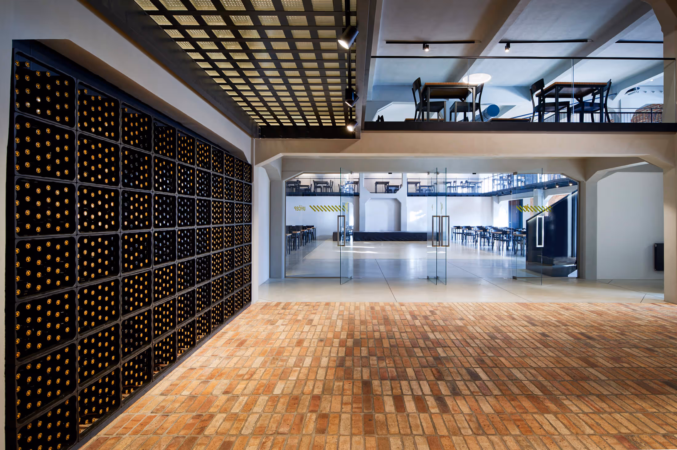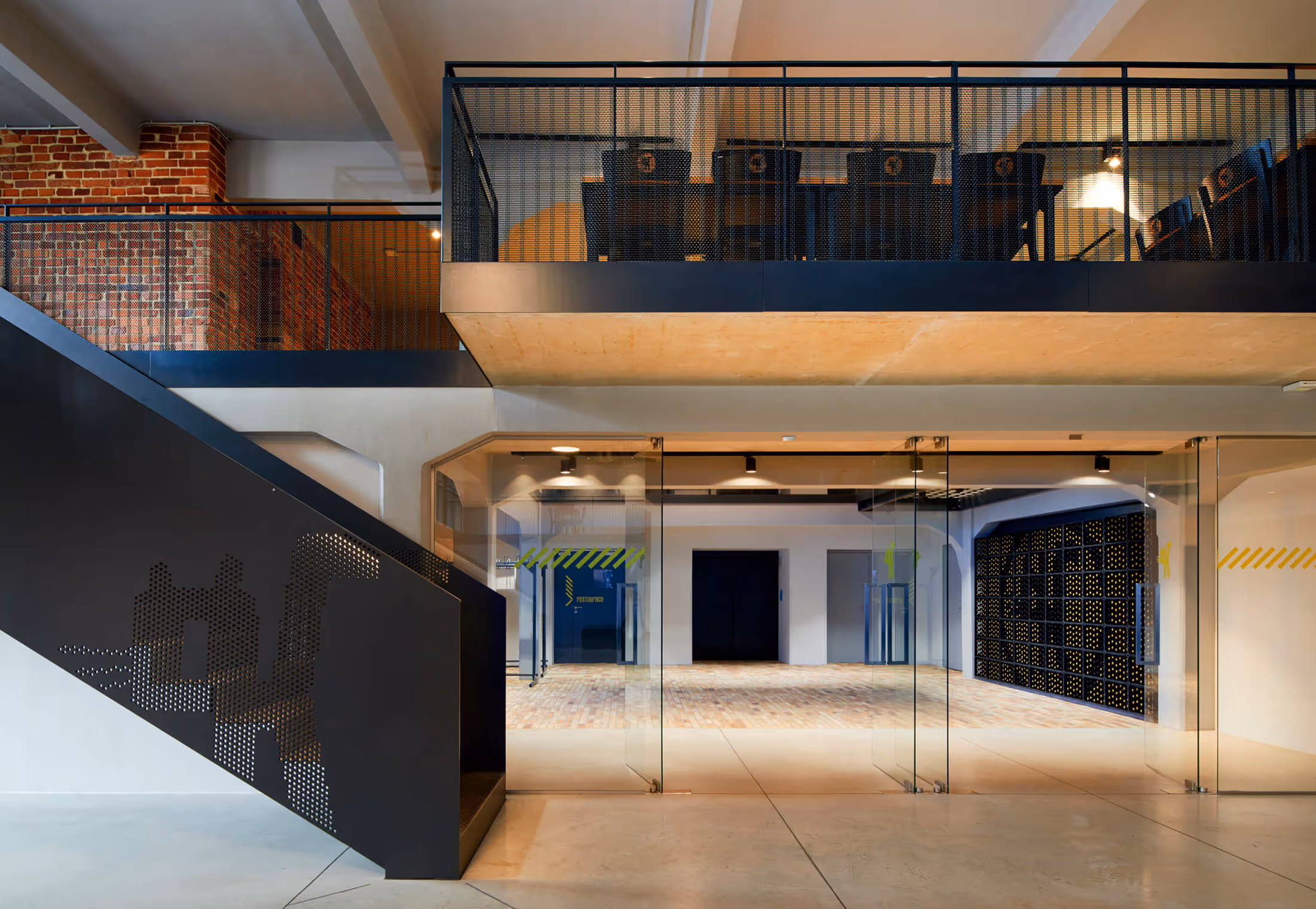 Konverze halového prostoru v přízemí dala vzniknout sálu pro více než dvě stovky hostů. Kdysi utilitární prostor skladů se otevřel – poškozené sloupy ustoupily, konstrukce byly vyneseny subtilními táhly a vznikla dvoupodlažní scéna s galerií, parketem a prostorem pro hudbu, přednášky i společenská setkání.