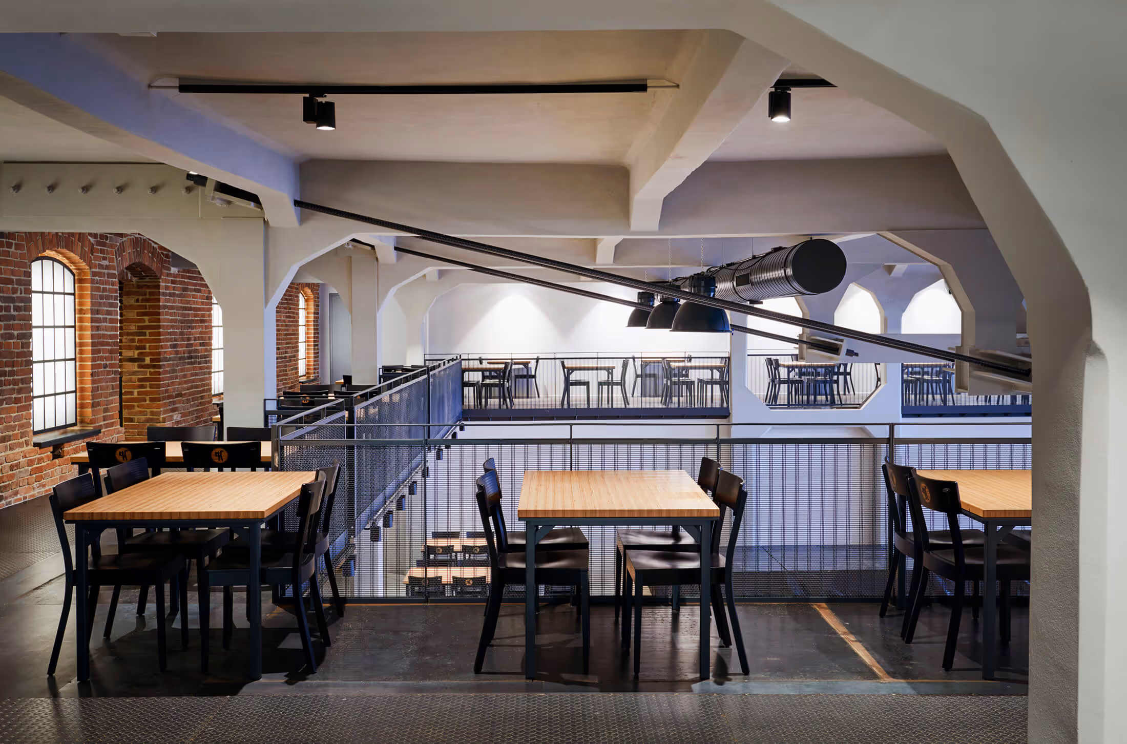 Světlo hraje hlavní roli. Denní proudí skrz fabrická okna, večer se prostor proměňuje díky repasovaným továrním svítidlům a světelným kruhům, které tvoří intimní atmosféru. Flexibilní světelné rampy nasvětlují sezení hostů, LED pásky akcentují schodiště i bary.