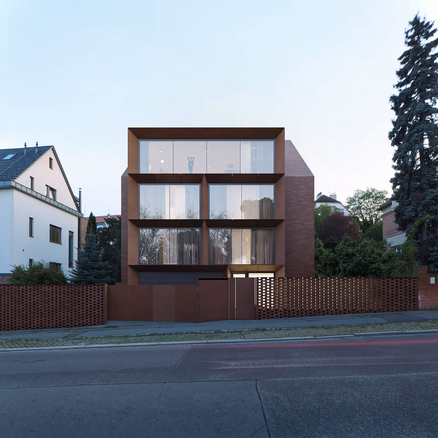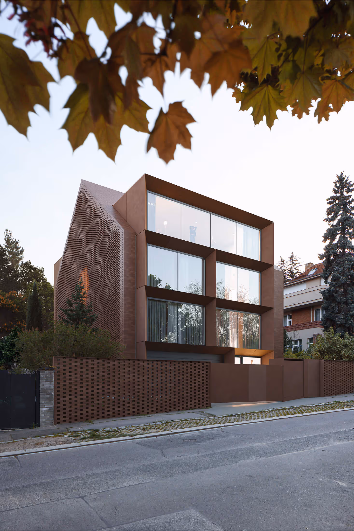 Temně hnědý plášť domu působí na první pohled stroze a kompaktně, avšak při bližším zkoumání odhaluje jemnější vrstvu hry. Perforovaná stěna, která propouští světlo v měnících se obrazech, vytváří jakousi krajku z cihel. Velkoformátová okna, zasazená hluboko do špalet, rámují výhledy do zahrad i k obzoru Prahy. Geometrické šikminy jejich rámů zdůrazňují hmotu domu, dávají jí rytmus a zároveň dodávají interiérům intimitu a ochranu.