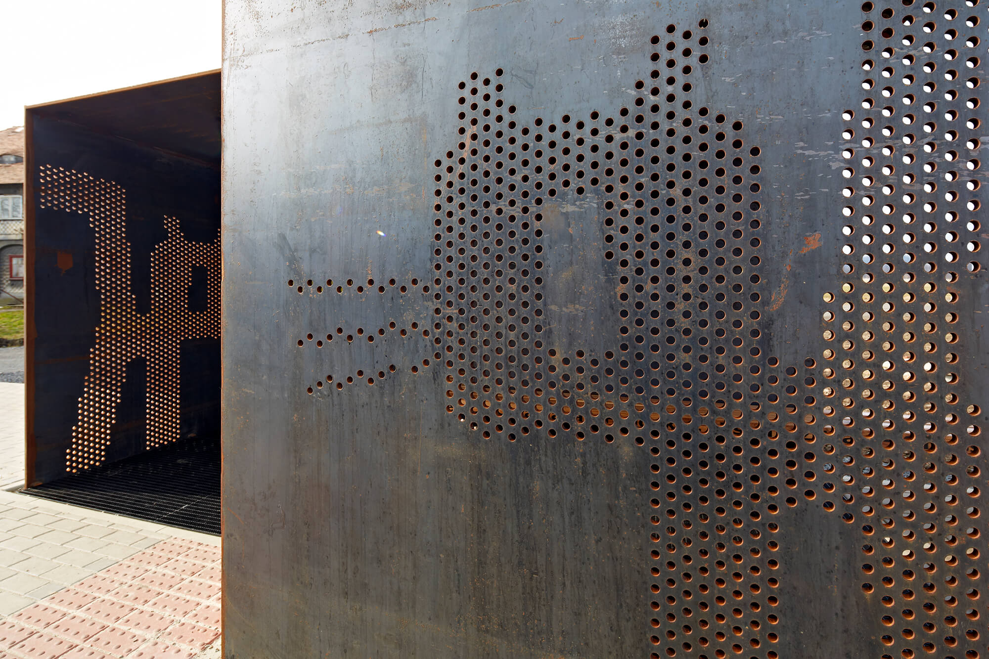 Materiálové řešení zdůrazňuje industriální charakter. Masivní ocelové plechy o tloušťce 20 mm jsou ponechány k přirozenému rezivění, čímž se objekt stává živou strukturou, která časem mění svůj výraz. Plechy jsou perforovány kruhovými otvory ve tvaru pivovarského loga – ve dne skrze ně dovnitř proniká světlo, v noci se naopak z interiéru do krajiny rozsvěcují světelné body LED světel. Podlahu tvoří černě komaxitovaný ocelový pororošt, jehož povrch se postupným používáním patinuje – v nejfrekventovanějších místech se odkrývá zinkování, a tím vzniká vizuální záznam pohybu a času.