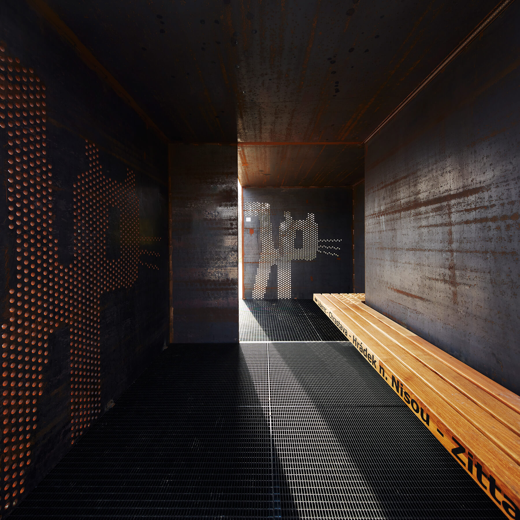 Interiér poskytuje jednoduchý komfort – krytý výhled na trať, lavičku pro čekající cestující a jízdní řády v atypických polykarbonátových pouzdrech. K detailům, které odlehčují přísnou formu, patří i otvírák na lahve a schránka na pivní zátky – drobný humor, jenž stavbu pevně svazuje s jejím prostředím.